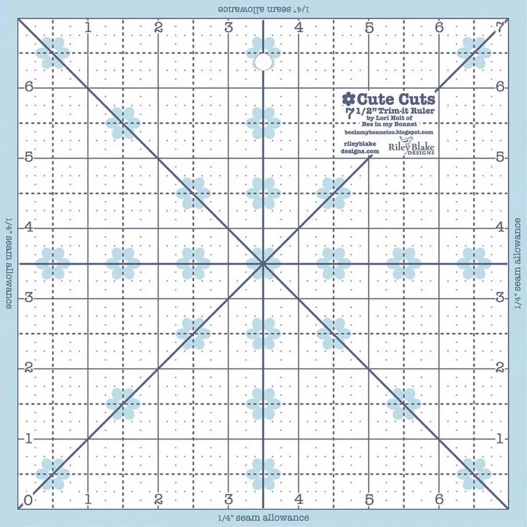 “Meet Cute” uses an easy corner triangle technique + a little slice ‘n dice action to achieve the geometric look of the design. My biggest tip in piecing this one really just comes to trimming the finished block… Get a 7.5″ squares ruler. (A ruler in the exact size of the unfinished block allows you to keep the block centered while also making sure the diagonal seams remain 45 degree angles in all 4 corners. I love this specific ruler because it has the 45 degree lines already marked on the ruler.) This “Meet Cute” quilt was so much funfor me to piece and was the quickest of the new batch!